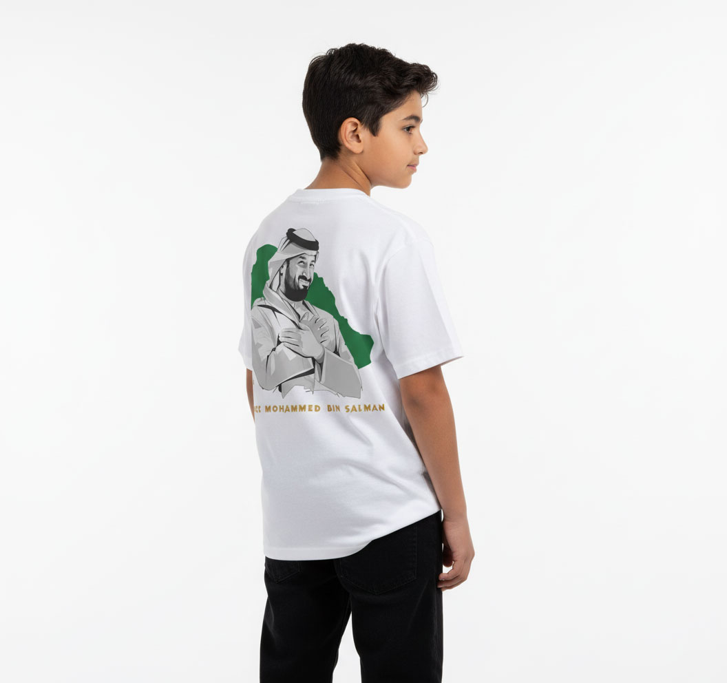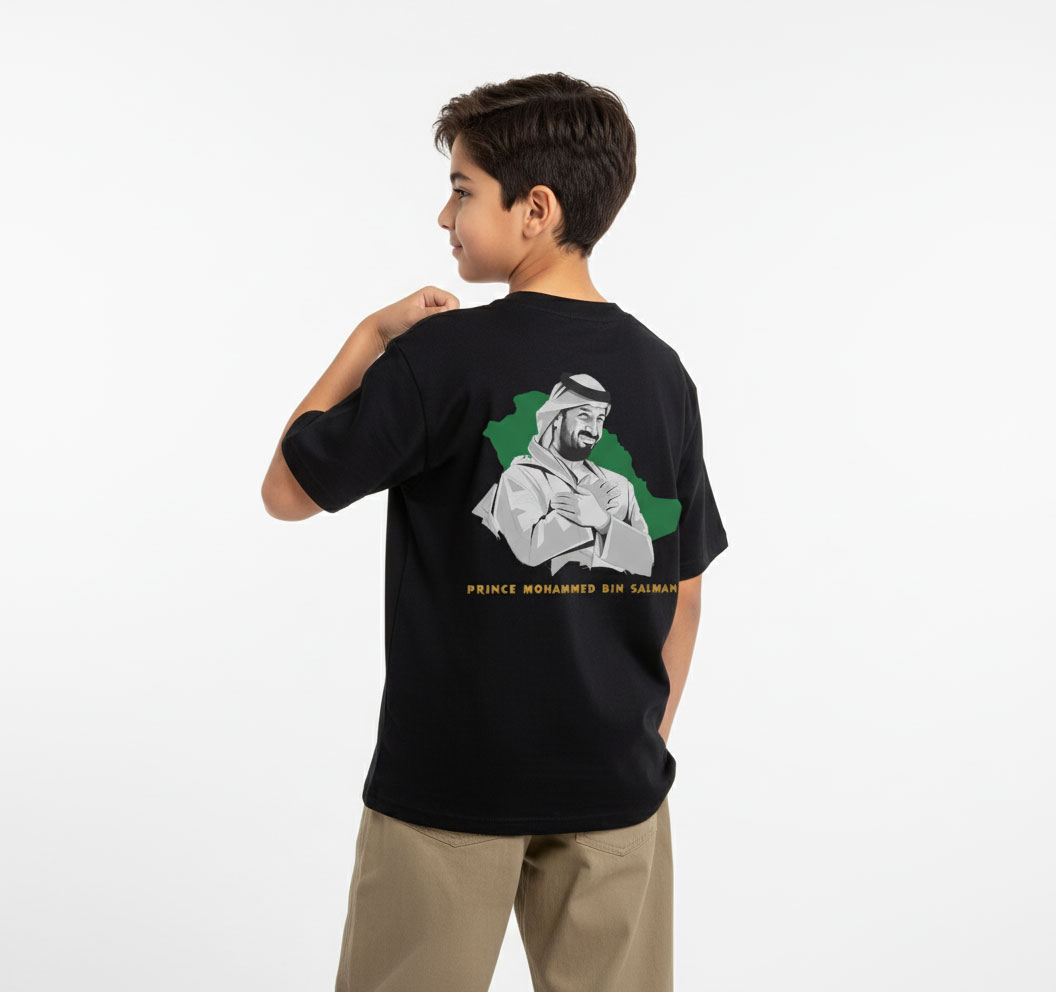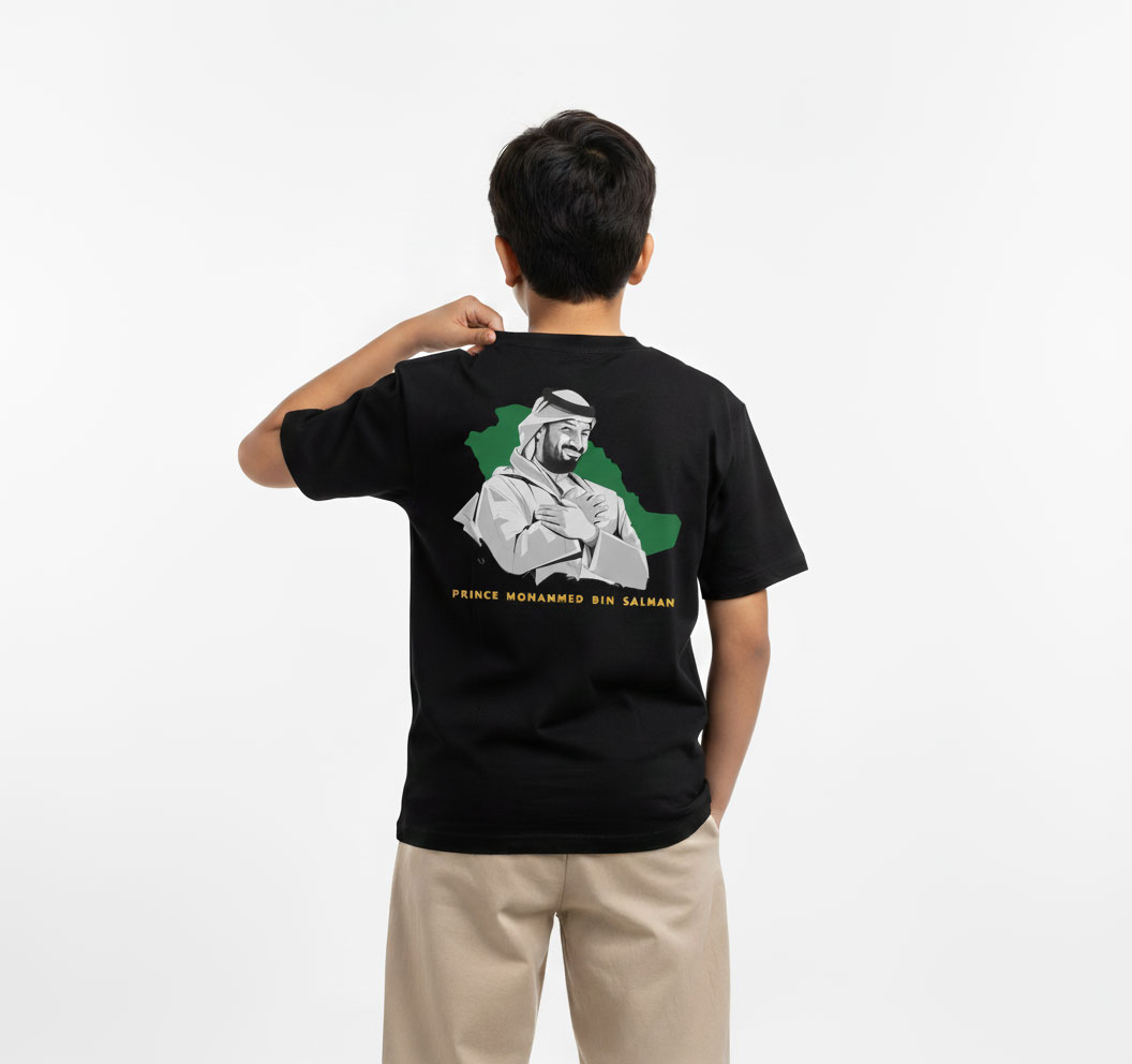 تصميم التيشيرت عبارة عن شعار السيفين و النخلة من الامام و صورة الامير محمد بن سلمان من الخلف مع خريطة المملكة العربية السعودية