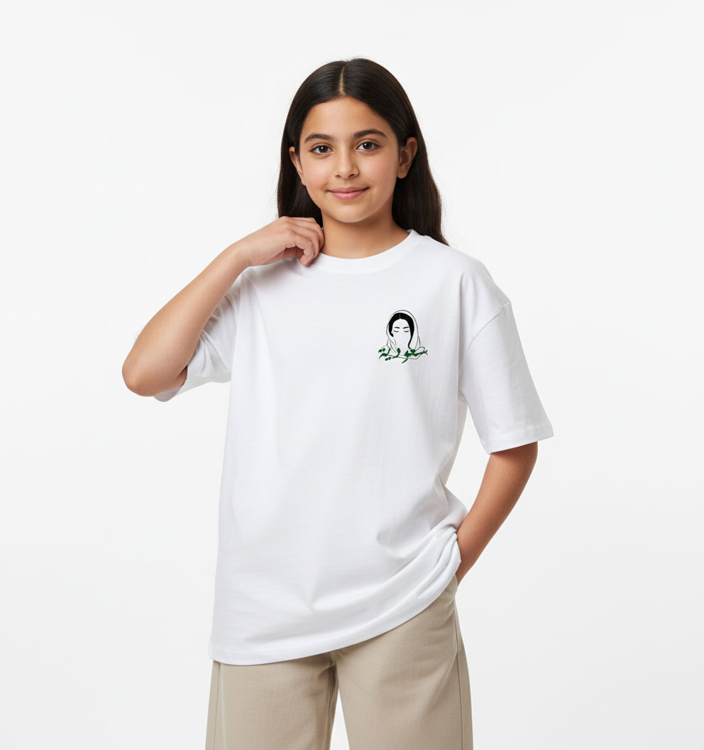 تصميم التيشيرت عبارة عن صورة لفتاه سعودية مصممة بطريقة عصرية لمزج اللمسة السعودية مع التصميم العصري و